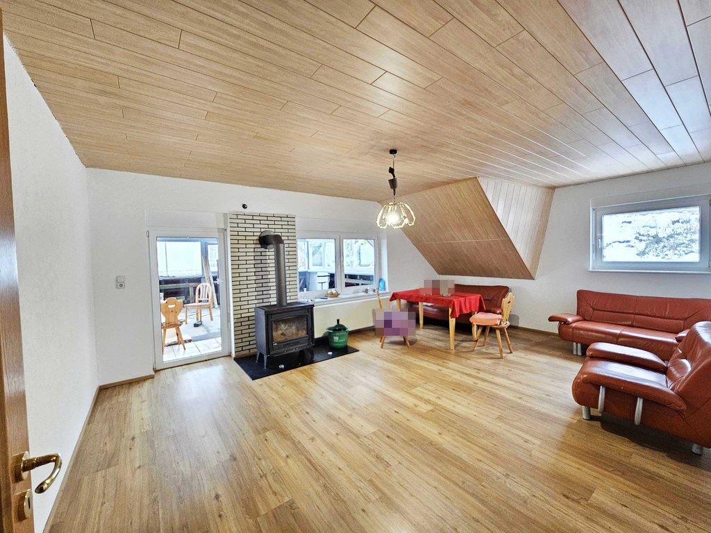 Im Obergeschoss erwartet Sie eine helle Wohnung mit ca. 91 m², die ebenfalls mit einem weitläufigen Wohn- und Essbereich, Balkonzugang, separater Küche, Schlafzimmer, Duschbad und Abstellraum ausgestattet ist. Auch hier sorgt ein Kaminofen für behagliche Wärme und eine angenehme Wohnatmosphäre.