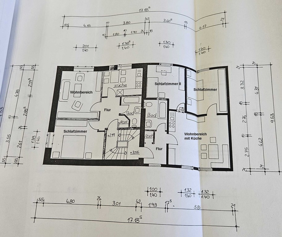 Zimmer: 6 (davon 4 Schlafzimmer) u. 2 Küchen, 2 Badezimmer mit Dusche